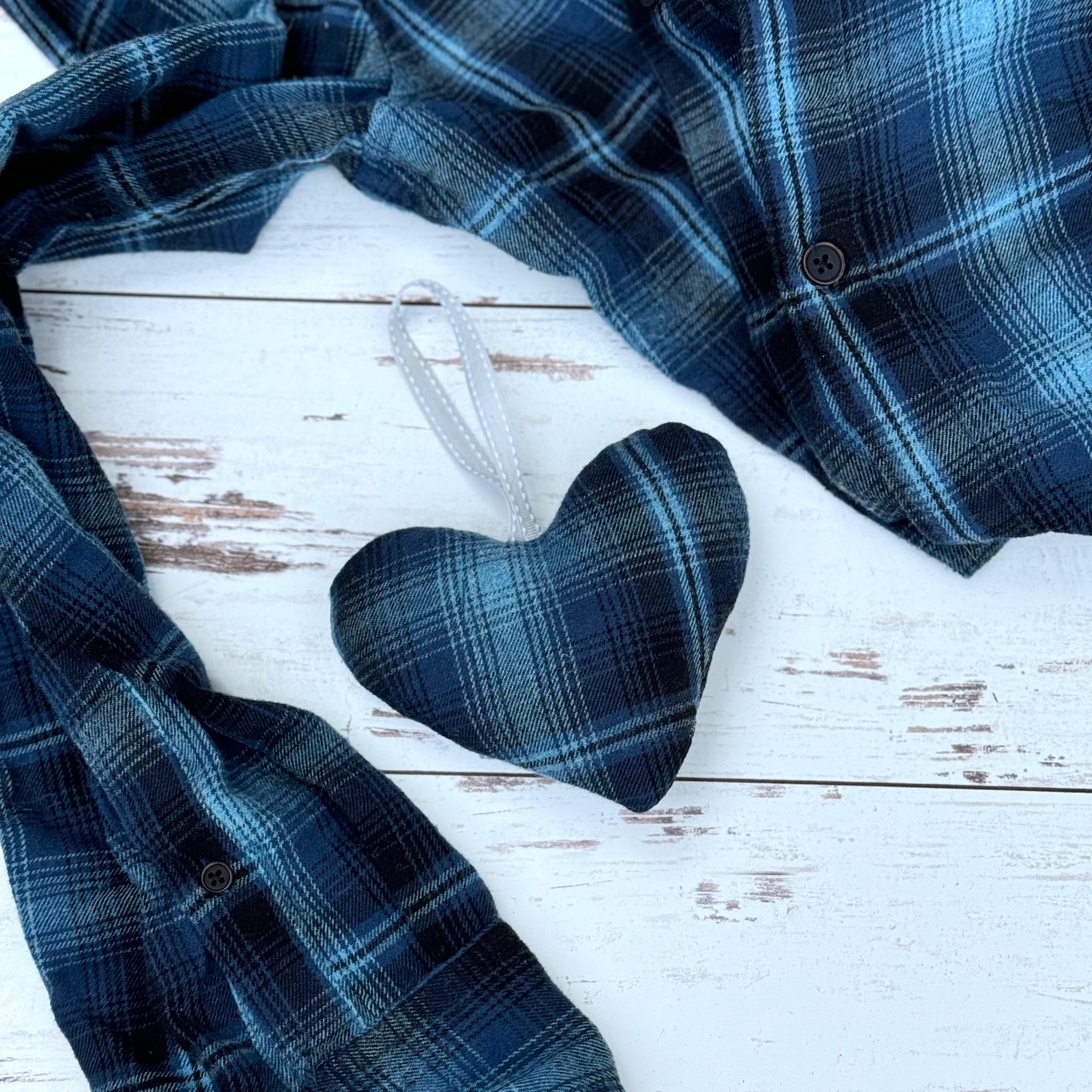 These heart ornaments are made from a loved one’s clothing. They’re ideal for using small fabric scraps, like those left over from a memory bear or quilt, making them perfect for large families or anyone unsure of what to do with extra fabric.